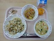 牛乳 野沢菜じゃこごはん 野菜炒め 豆腐の四川スープ アーモンド小魚 みかん