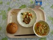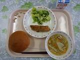牛乳 ミルクパン 白身魚のバーベキューソース ドレッシングサラダ ペイザンヌスープ 炒り大豆