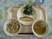 牛乳 ひじきごはん 鮭のゆうあん焼き おひたし ごま仕立ての味噌汁 アーモンド