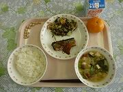 牛乳 ごはん 秋刀魚の甘露煮 キャベツと昆布のレモンあえ なめこ汁 みかん 炒り大豆
