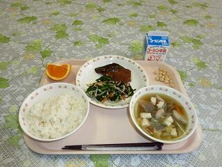 牛乳 ごはん 鯖の味噌煮 のりあえ けんちん汁 清見オレンジ 炒り大豆