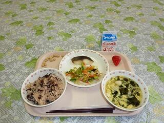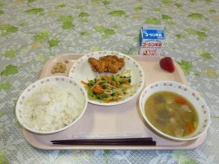 牛乳 ごはん 鶏の唐揚げ からしあえ ごま仕立ての味噌汁 いちご 炒り大豆