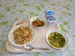 今日の献立は,6年生のリクエストのキムタクチャーハンです。米はしょうゆ,酒を入れて炊き,サラダ油でベーコンを炒め,キムチ,たくあん,ねぎをしょうゆ,みりん,塩,こしょうで味を付けています。色は地味ですが,味はおいしいです。