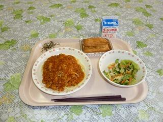 牛乳 スパゲティミートソース ハニーマスタードドレッシングサラダ アップルパイ 小魚