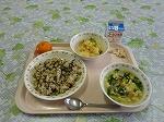 牛乳 ひじきと鶏肉のピラフ じゃがいもの味噌サラダ チーズスープ 冷凍みかん カシューナッツ