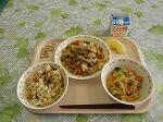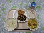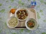 牛乳 ごはん 鶏の唐揚げ 大豆の磯煮 えのき茸の味噌汁 小魚