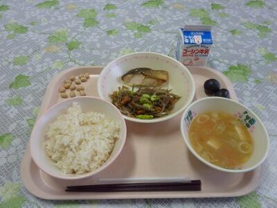 牛乳 ごはん ほっけの干物 五目きんぴら さつま汁 巨峰 炒り大豆