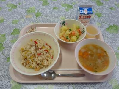 牛乳 ナシゴレン マセドアンサラダ ミネストローネスープ アップルゼリー 大豆小魚