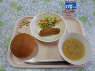 牛乳 ミルクパン メルルーサのアーモンド揚げ ゆず入りドレッシングサラダ キャベツとベーコンのスープ 炒り大豆