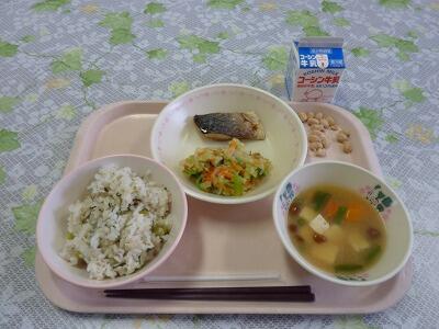 牛乳 青菜ごはん いなだの照り焼き からしあえ なめこ汁 きなこ大豆