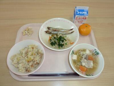 牛乳 秋の香りごはん ししゃも焼き もやしのポン酢あえ 豚汁 みかん カシューナッツ