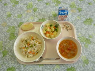 牛乳 ツナピラフ マセドアンサラダ ミネストローネ りんご 大豆小魚
