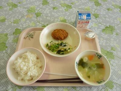 牛乳 ごはん カリカリがんも からしあえ じゃがいもの味噌汁 一口ピーチゼリー