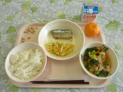 牛乳 ごはん さんまの甘露煮 白菜のおひたし 栄養すいとん みかん 炒り大豆