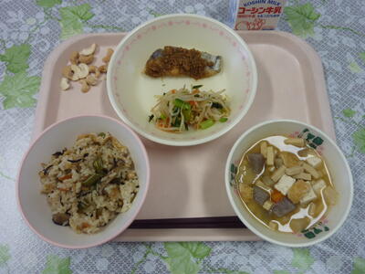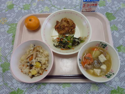 牛乳 秋の香り御飯 とりの唐揚げ 磯香あえ 豚汁 みかん