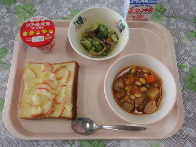 牛乳 アップルトースト ポークビーンズ しめじ入りサラダ