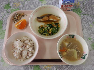 牛乳 梅ごはん ムツの照り焼き こまつなとコーンのあえもの ごま仕立てのみそ汁