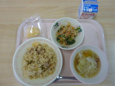 キムチチャーハン・切干大根のナムル・五目スープ・冷凍りんご・牛乳