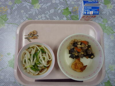 冷やしうどん・ささみの天ぷら・五目豆・小魚カシューナッツ・牛乳