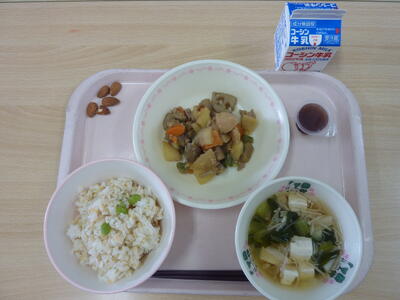 鮭のちらし寿司・炒り鶏・すまし汁・ひとくちぶどうゼリー・粒アーモンド・牛乳