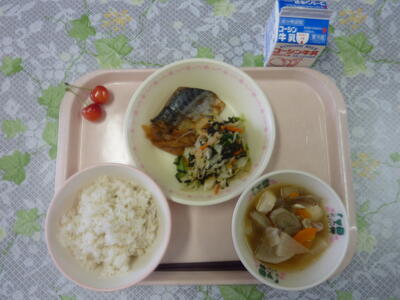 ご飯・鯖の味噌煮・磯香和え・けんちん汁・さくらんぼ・牛乳
