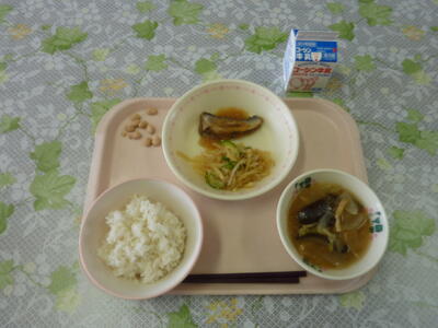 ごはん・いわしのおろし煮・じゃがいものごまずあえ・なすのみそ汁・きなこ大豆・牛乳
