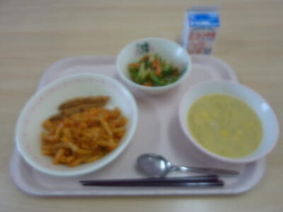 ペンネアラビアータ・きびなごのカリカリフライ・バジルドレッシングサラダ・コーンスープ・牛乳