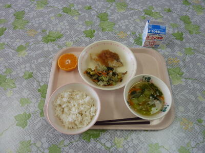 たらのバーベキューソースは、サクサクの衣に、バーベキューソースがかかっています。サクサクをそのまま食べるのもいいですが、ソースがしみて柔らかくなった衣のたらを、パクッと食べるのも良いものです。サラダは、しょう油ベースのドレッシングがひじきによく染みこんでとても美味しいです。ポテトスープは、ポテトが細切りで柔らかく、もしかしたら気づかずに食べている子がいるかもしれません。みかんは今日も甘かったです。どれも美味しくいただきました。ごちそうさまでした。