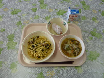 柏産ちんげん菜入り上海焼きそば・ワンタンスープ・とうふのドーナッツ・牛乳