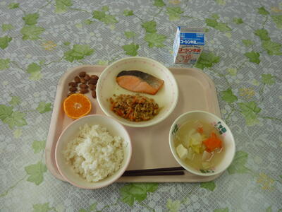 ごはん・さけの塩焼き・切り干し大根の煮物・じゃがいものみそ汁・みかん・アーモンド・牛乳