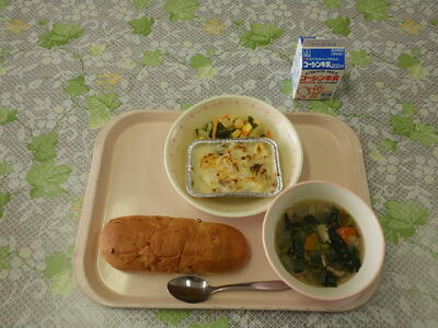 あまなっとうパン・柏産野菜のグラタン・わかめとコーンのサラダ・ほうれん草のスープ・牛乳