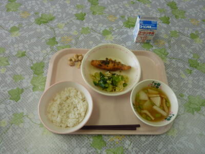 今日は「昔の給食」。給食が始まった頃のメニューだそうです。さけの塩焼きは適度な塩味で、ごはんとよく合います。切り干し大根の煮物は、今も昔も子どもたちに人気です。切り干し大根にはしっかりと味がしみこんでとても美味しかったです。じゃがいものみそ汁は、出汁が効いていてとても優しいお味でした。アーモンドは香ばしかったです。