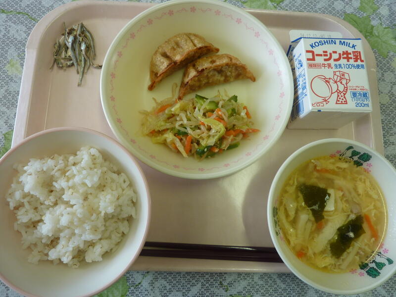 本日の献立は、ご飯、揚げ餃子、中華サラダ、卵入り豆腐の四川スープ、小魚、牛乳です。
