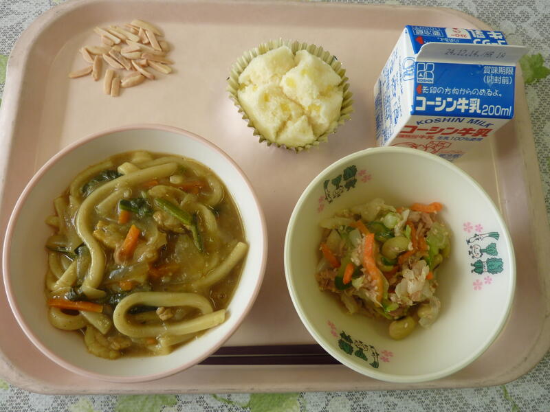 本日の献立は、カレーうどん、ツナ和え、チーズ入り蒸しパン、アーモンド、牛乳です。