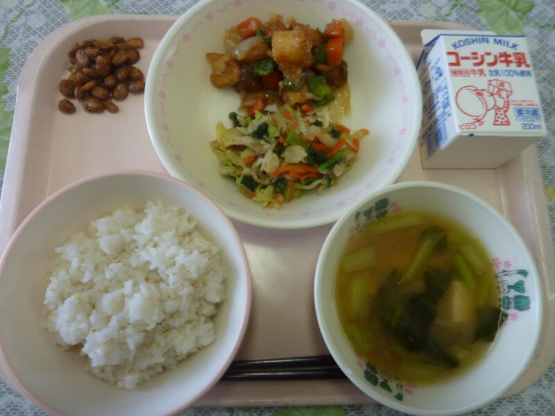 本日の献立は、ご飯、白身魚と野菜の揚げ煮、おかかあえ、豆腐の味噌汁、黒糖ビーンズ、牛乳です。