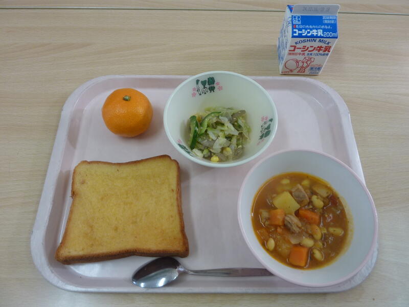 本日の献立は、ハニートースト、鶏肉と大豆のカレー煮込み、ゴボウのイタリアンサラダ、ミカン、牛乳です。