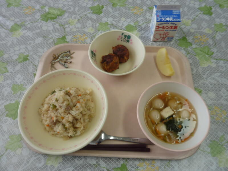 本日の献立は、チャーハン、揚げシュウマイ、ウズラの卵入り五目スープ、リンゴ、牛乳です。