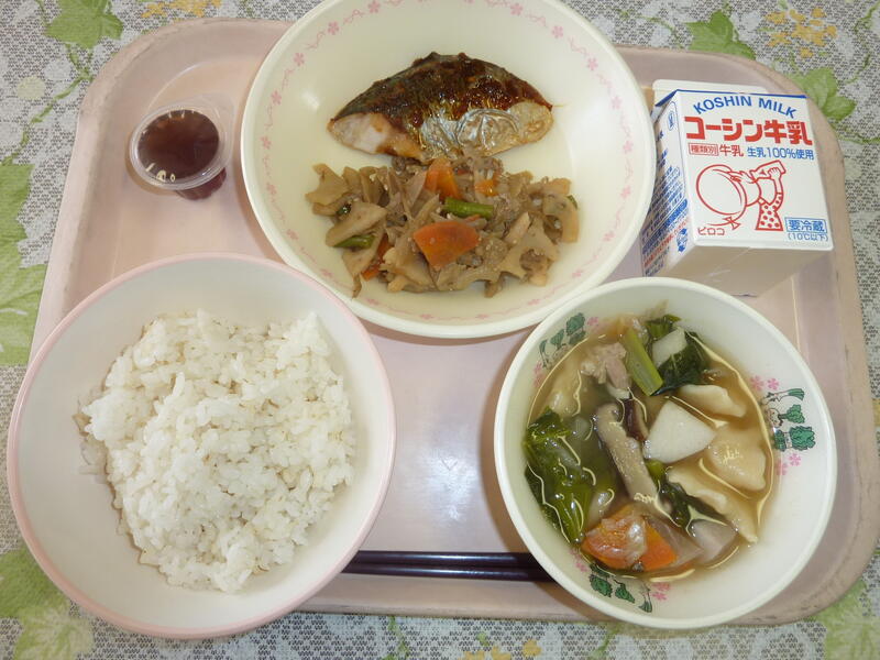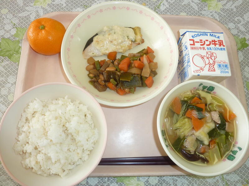 本日の献立は、ご飯、鮭のみそマヨネーズ焼き、五目煮、せんべい汁、みかん、牛乳です。