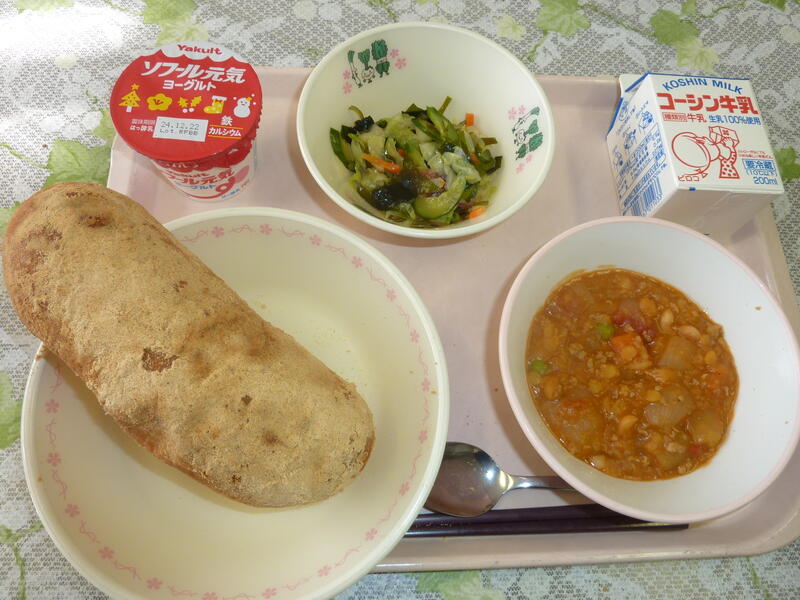 本日の献立は、ぶどうパン、白身魚のパン粉焼き、ハチミツ入りドレッシングサラダ、卵とあさりの野菜スープ、