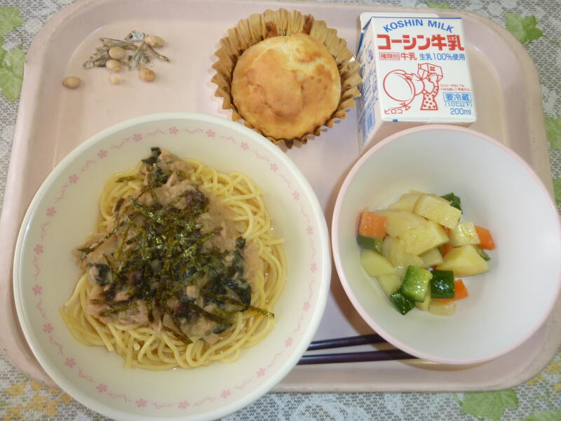 本日の給食は、大根とツナのスパゲティ、マセドアンサラダ、手作りメープルマフィン、大豆小魚、牛乳です。