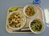 今日の献立は,チゲ豆腐丼です。チゲは朝鮮料理の鍋物のことをいいます。魚介や肉,豆腐,野菜,キムチなどを入れ,テンメンジャン,コチジャンなどで味をつけたものを言います。今日の具材は,しょうが,豆腐,豚肉,キムチ,ねぎ,にんじん,チンゲンサイ,にらです。