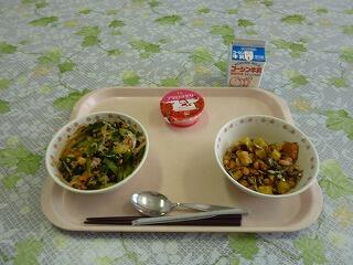 今日の献立は,ひじきごはんです。ひじきは縄文時代や弥生時代の遺跡の発掘物にひじきと思われる海藻が付着していたことから,その時代から食べられていたとされています。日本では川の水が軟水のため,カルシウムがあまり含まれておらず,農作物からカルシウムを摂取するのは困難であったので,昔からカルシウムを補うためにひじきなどの海藻を利用してきたと考えられます。