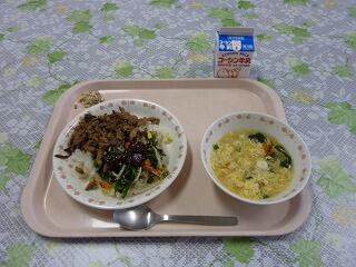 今日の献立は,ビビンバです。韓国料理の混ぜごはんです。とうばんじゃんの辛味がおいしさを引き出しています。韓国でもビビンバにわかめスープがよく付きます。