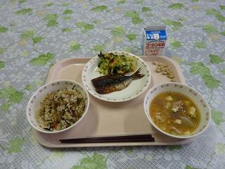 牛乳 ひじきごはん 鰯のさんしょう焼き おひたし 豚汁 炒り大豆