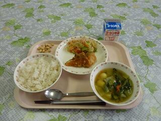牛乳 ごはん メルルーサのピリカラソースがけ 春雨サラダ うずらの卵入りカレースープ きな粉豆