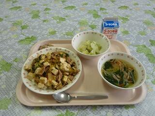 牛乳 チゲ豆腐丼 ビーフンスープ 磯ポテト アーモンド小魚
