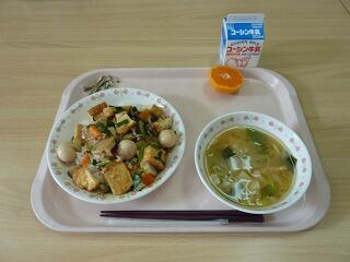 牛乳 厚揚げ丼 じゃがいもの味噌汁 小魚 みかん
