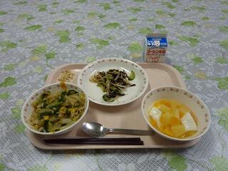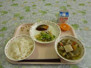 牛乳 ごはん 鯖の柚子味噌煮 からしあえ きりたんぽ汁 みかん 炒り大豆