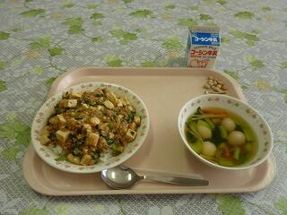 牛乳 麻婆豆腐丼 中華卵スープ 大豆小魚
