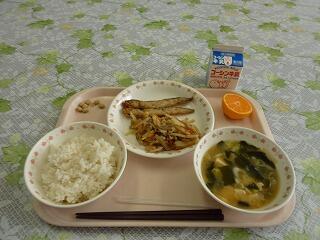 牛乳 ごはん ししゃもの唐揚げ じゃがいもの金平煮 豆腐とわかめの味噌汁 みかん 炒り大豆